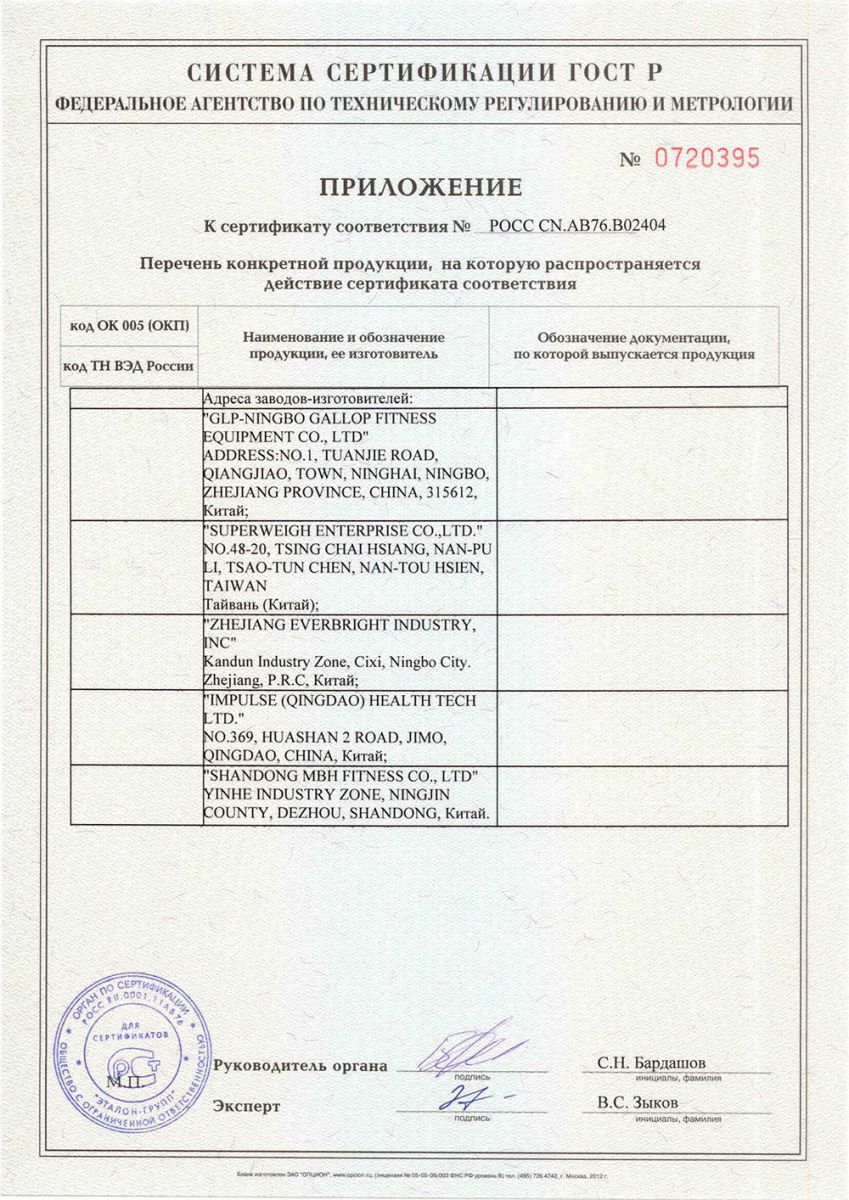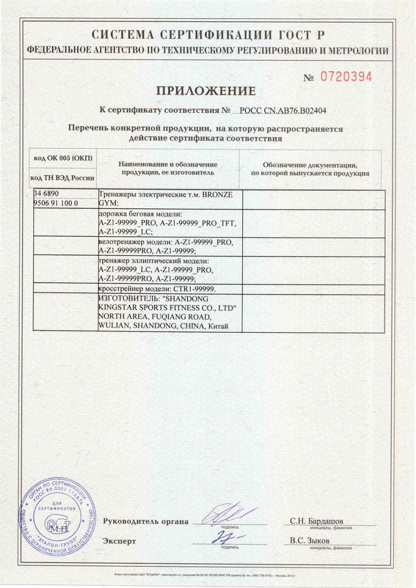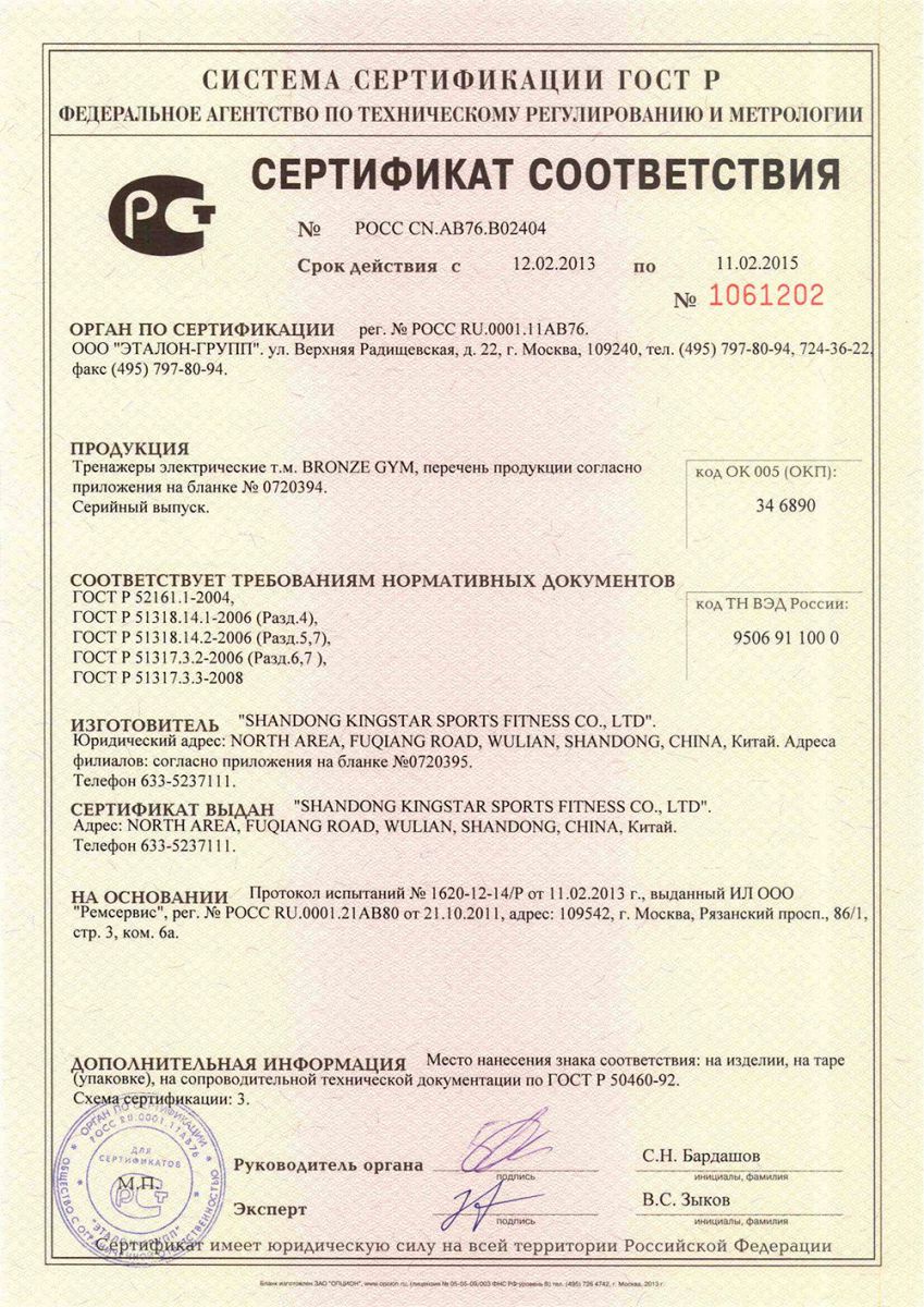 Сертификаты на продукцию Bronze Gym