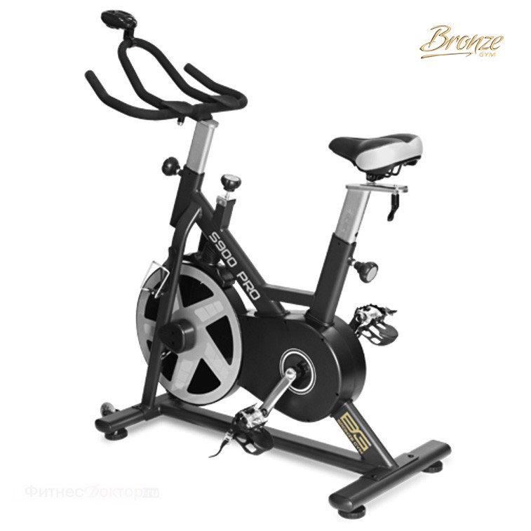 - Bronze Gym S900 PRO: конструкция с тяжелым маховиком (22 кг) и магнитной системой нагрузки. Подходит пользователем весом до 159 кг. Фиксирует среднюю скорость, пройденную дистанцию и частоту вращения педалей. Питается от батареек.