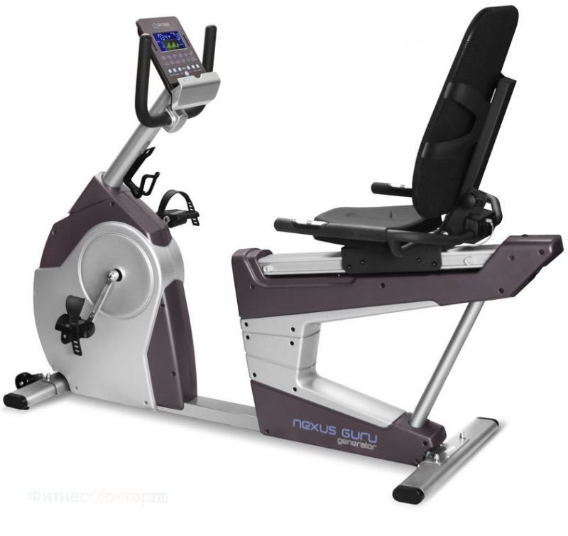 - Nexus Guru RB HRC: горизонтальный велотренажер, основное преимущество которого — комфорт при использовании. Позвоночник поддерживается спинкой, обтянутой дышащей сеточкой. Руль, сидение, ремешки на педалях регулируются. Функционал тоже неплох: 19 программ, 32 уровня нагрузки, встроенный кардиодатчик и возможность подключить беспроводной пульсометр.